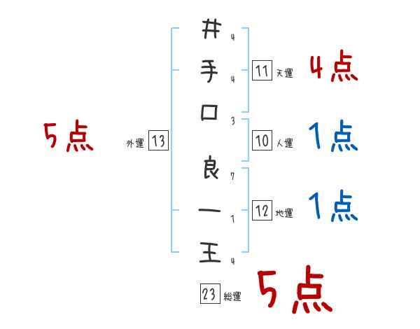 総運![]() | 井手口良一王さんの総運は23画の5つ星!想像力に優れ活力がある。一代で成功し名誉を手に入れる。 あなたの人生を表す1番重要な運勢です。生涯を通じて影響する総合運となり、主に50歳以降の晩年期に影響を及ぼします。 |