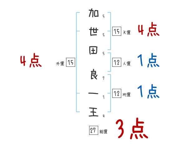 地運![]() | 加世田良一王さんの地運は12画の1つ星!簡単な失敗で諦めてしまいやすいかも。着実に行動すると良いでしょう。 個性を表す基礎的な運勢です。性格形成や対人関係、行動力など家庭環境に影響されます。主に誕生してから20歳くらいまでの若年期の運勢を表します。 |