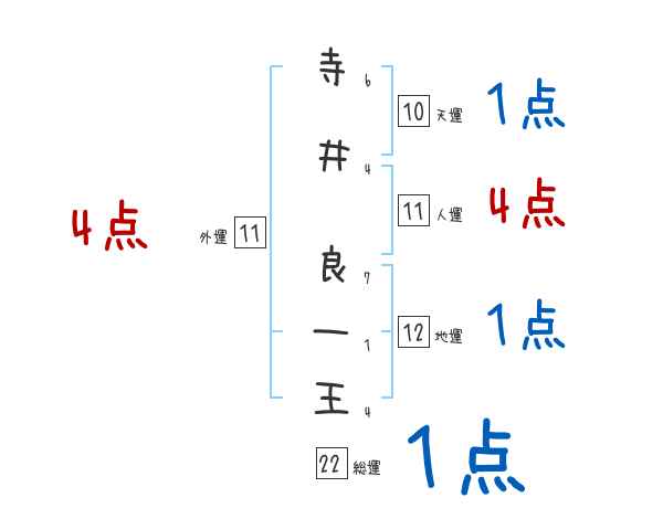 天運![]() | 寺井良一王さんの天運は10画の1つ星!不安を感じやすい傾向。ストレスを抱えないように注意しましょう。 家系が持つ宿命的な運勢を表します。祖先から受け継いだ苗字ですので自分の力が及びません。家柄を象徴します。 |