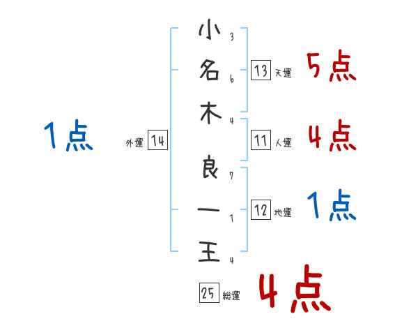天運![]() | 小名木良一王さんの天運は13画の5つ星!才能に恵まれ人気がある。名声を手に入れる。円満な人生。 家系が持つ宿命的な運勢を表します。祖先から受け継いだ苗字ですので自分の力が及びません。家柄を象徴します。 |