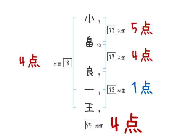 天運![]() | 小畠良一王さんの天運は13画の5つ星!才能に恵まれ人気がある。名声を手に入れる。円満な人生。 家系が持つ宿命的な運勢を表します。祖先から受け継いだ苗字ですので自分の力が及びません。家柄を象徴します。 |