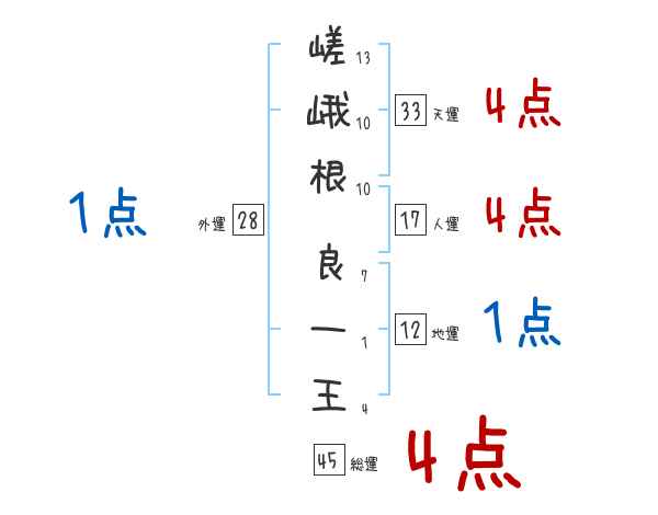 外運![]() | 嵯峨根良一王さんの外運は28画の1つ星!家庭環境に注意。スポーツで活躍できる能力があるかも。 生活面を象徴する運勢です。外部から受ける影響力を表し、結婚運、家庭運や職場、環境への順応性を表します。 |