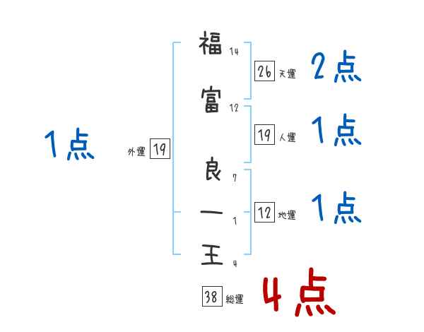 人運![]() | 福富良一王さんの人運は19画の1つ星!優れた才能を持ちますが、協調性が足りないことも。周りの人と協力する事を意識しましょう。 性格や才能などを表す2番目に重要な運勢です。人間関係や協調性、社会的な成功に影響します。主に20歳から50歳ぐらいまでの中年期の運勢を表します。 |