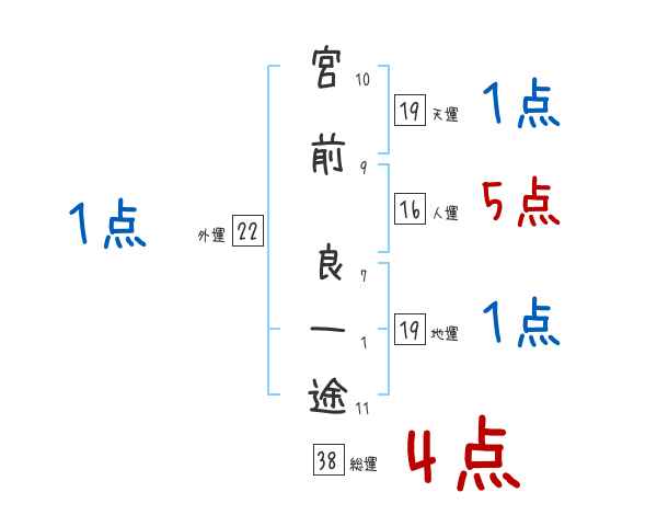 天運![]() | 宮前良一途さんの天運は19画の1つ星!優れた才能を持ちますが、協調性が足りないことも。周りの人と協力する事を意識しましょう。 家系が持つ宿命的な運勢を表します。祖先から受け継いだ苗字ですので自分の力が及びません。家柄を象徴します。 |