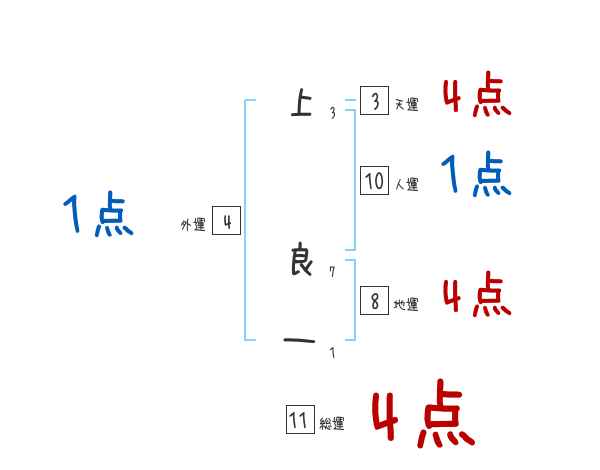 人運![]() | 上良一さんの人運は10画の1つ星!不安を感じやすい傾向。ストレスを抱えないように注意しましょう。 性格や才能などを表す2番目に重要な運勢です。人間関係や協調性、社会的な成功に影響します。主に20歳から50歳ぐらいまでの中年期の運勢を表します。 |