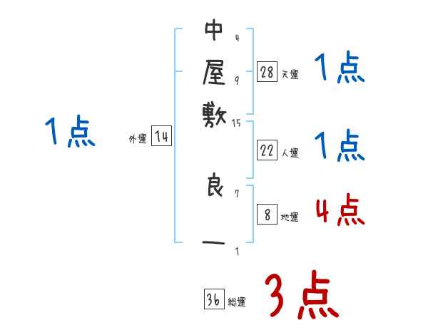 外運![]() | 中屋敷良一さんの外運は14画の1つ星!人に対して優しいがストレスを溜め込みがち。人間関係のトラブルを避けるよう気をつけましょう。 生活面を象徴する運勢です。外部から受ける影響力を表し、結婚運、家庭運や職場、環境への順応性を表します。 |