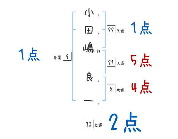 天運![]() | 小田嶋良一さんの天運は22画の1つ星!努力することが苦手ないっぽう手先が器用。芸術性にも優れる。 家系が持つ宿命的な運勢を表します。祖先から受け継いだ苗字ですので自分の力が及びません。家柄を象徴します。 |