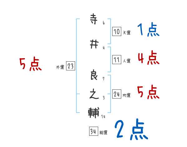 外運![]() | 寺井良之輔さんの外運は23画の5つ星!想像力に優れ活力がある。一代で成功し名誉を手に入れる。 生活面を象徴する運勢です。外部から受ける影響力を表し、結婚運、家庭運や職場、環境への順応性を表します。 |