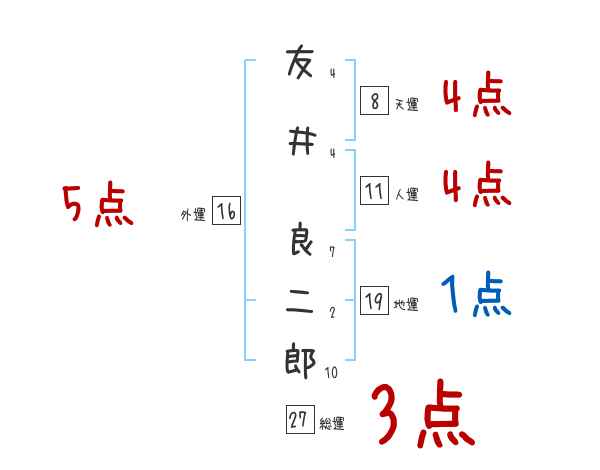 外運![]() | 友井良二郎さんの外運は16画の5つ星!人望が厚く大きく発展する。逆転成功が見える。 生活面を象徴する運勢です。外部から受ける影響力を表し、結婚運、家庭運や職場、環境への順応性を表します。 |
