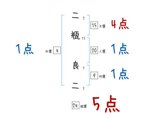 総運![]() | 二瓶良二さんの総運は24画の5つ星!家庭運が良く順調な人生。金運にも恵まれる。 あなたの人生を表す1番重要な運勢です。生涯を通じて影響する総合運となり、主に50歳以降の晩年期に影響を及ぼします。 |