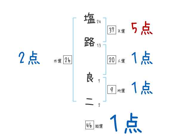 総運![]() | 塩路良二さんの総運は46画の1つ星!迷走することが多く苦労するかも。目先のことにとらわれないように。 あなたの人生を表す1番重要な運勢です。生涯を通じて影響する総合運となり、主に50歳以降の晩年期に影響を及ぼします。 |