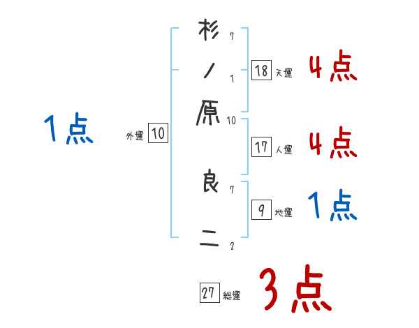 天運![]() | 杉ノ原良二さんの天運は18画の4つ星!情熱的で剛気。忍耐力があり信頼される。 家系が持つ宿命的な運勢を表します。祖先から受け継いだ苗字ですので自分の力が及びません。家柄を象徴します。 |