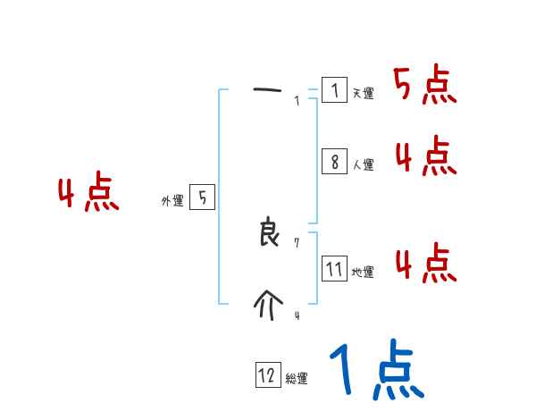 外運![]() | 一良介さんの外運は5画の4つ星!健康で安泰。協調性に優れ、財産に恵まれる。 生活面を象徴する運勢です。外部から受ける影響力を表し、結婚運、家庭運や職場、環境への順応性を表します。 |