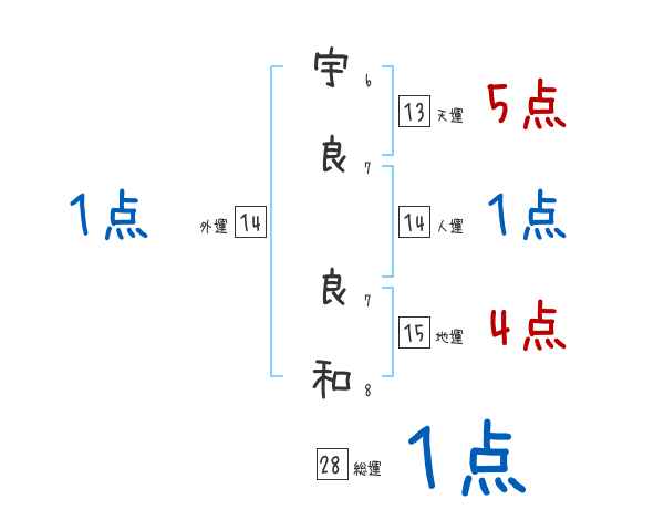 天運![]() | 宇良良和さんの天運は13画の5つ星!才能に恵まれ人気がある。名声を手に入れる。円満な人生。 家系が持つ宿命的な運勢を表します。祖先から受け継いだ苗字ですので自分の力が及びません。家柄を象徴します。 |