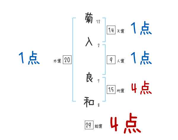 天運![]() | 菊入良和さんの天運は14画の1つ星!人に対して優しいがストレスを溜め込みがち。人間関係のトラブルを避けるよう気をつけましょう。 家系が持つ宿命的な運勢を表します。祖先から受け継いだ苗字ですので自分の力が及びません。家柄を象徴します。 |
