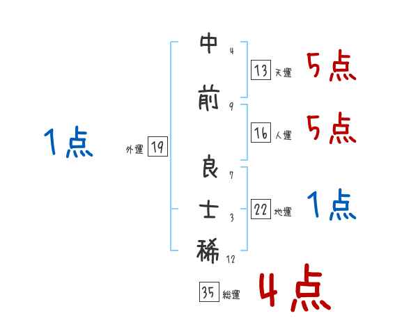 | 総運  | 中前良士稀さんの総運は35画の4つ星!温厚な性格で感受性が高い。穏和な性格で人望が厚い。あなたの人生を表す1番重要な運勢です。生涯を通じて影響する総合運となり、主に50歳以降の晩年期に影響を及ぼします。 |