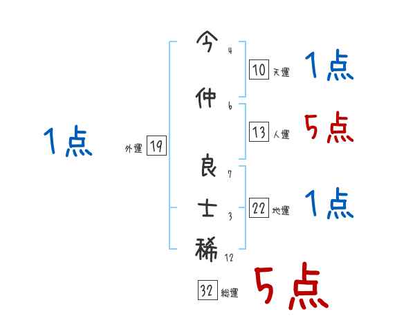 天運![]() | 今仲良士稀さんの天運は10画の1つ星!不安を感じやすい傾向。ストレスを抱えないように注意しましょう。 家系が持つ宿命的な運勢を表します。祖先から受け継いだ苗字ですので自分の力が及びません。家柄を象徴します。 |