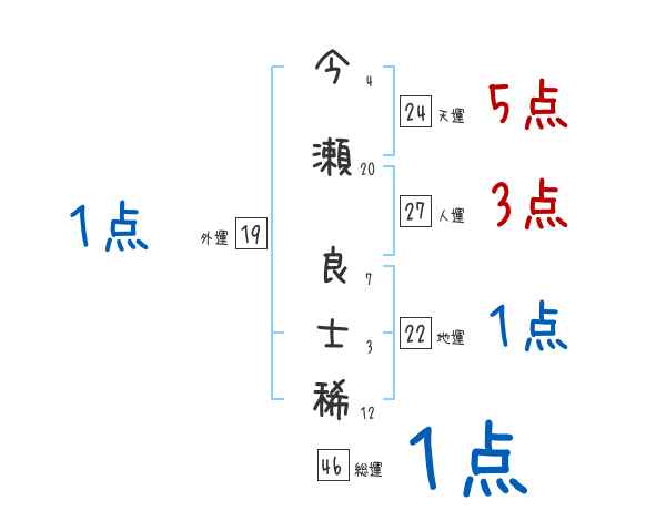 天運![]() | 今瀬良士稀さんの天運は24画の5つ星!家庭運が良く順調な人生。金運にも恵まれる。 家系が持つ宿命的な運勢を表します。祖先から受け継いだ苗字ですので自分の力が及びません。家柄を象徴します。 |