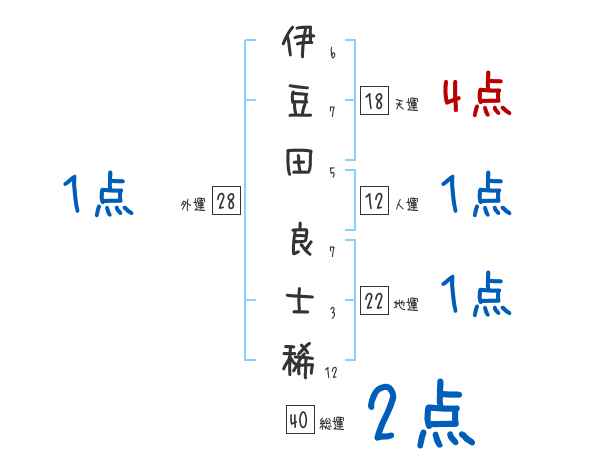 外運![]() | 伊豆田良士稀さんの外運は28画の1つ星!家庭環境に注意。スポーツで活躍できる能力があるかも。 生活面を象徴する運勢です。外部から受ける影響力を表し、結婚運、家庭運や職場、環境への順応性を表します。 |