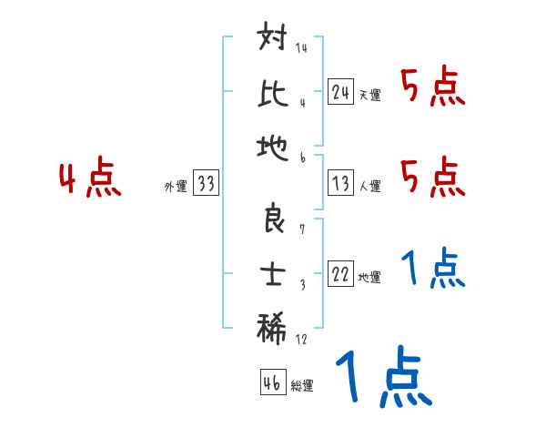 総運![]() | 対比地良士稀さんの総運は46画の1つ星!迷走することが多く苦労するかも。目先のことにとらわれないように。 あなたの人生を表す1番重要な運勢です。生涯を通じて影響する総合運となり、主に50歳以降の晩年期に影響を及ぼします。 |