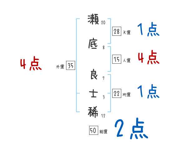 外運![]() | 瀬底良士稀さんの外運は35画の4つ星!温厚な性格で感受性が高い。穏和な性格で人望が厚い。 生活面を象徴する運勢です。外部から受ける影響力を表し、結婚運、家庭運や職場、環境への順応性を表します。 |