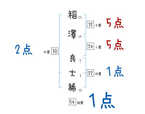 天運![]() | 稲澤良士稀さんの天運は32画の5つ星!柔軟性があり成功する。チャンスが多く金運が良い。 家系が持つ宿命的な運勢を表します。祖先から受け継いだ苗字ですので自分の力が及びません。家柄を象徴します。 |