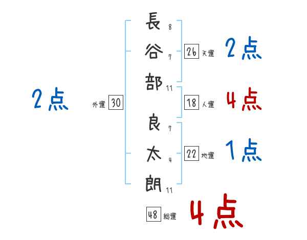 天運![]() | 長谷部良太朗さんの天運は26画の2つ星!波瀾万丈かも。信頼できる人を大事にしましょう。 家系が持つ宿命的な運勢を表します。祖先から受け継いだ苗字ですので自分の力が及びません。家柄を象徴します。 |