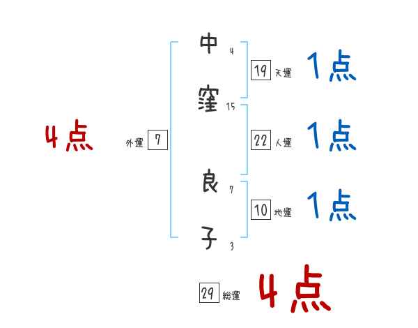 総運![]() | 中窪良子さんの総運は29画の4つ星!完全主義で才能がある。厳格な心の持ち主。 あなたの人生を表す1番重要な運勢です。生涯を通じて影響する総合運となり、主に50歳以降の晩年期に影響を及ぼします。 |