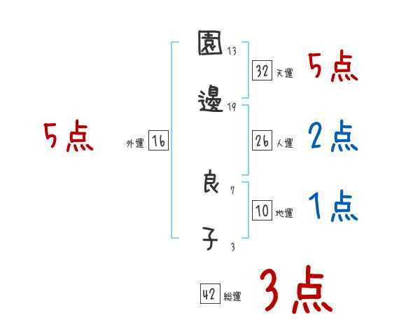 外運![]() | 園邊良子さんの外運は16画の5つ星!人望が厚く大きく発展する。逆転成功が見える。 生活面を象徴する運勢です。外部から受ける影響力を表し、結婚運、家庭運や職場、環境への順応性を表します。 |