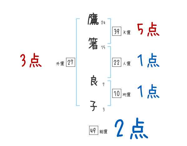 天運![]() | 鷹箸良子さんの天運は39画の5つ星!社交性に優れ人望が厚い。人の上に立ち成功する。 家系が持つ宿命的な運勢を表します。祖先から受け継いだ苗字ですので自分の力が及びません。家柄を象徴します。 |