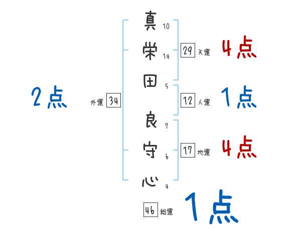 外運![]() | 真栄田良守心さんの外運は34画の2つ星!独創性に優れるが、自尊心が強く災難に注意しましょう。 生活面を象徴する運勢です。外部から受ける影響力を表し、結婚運、家庭運や職場、環境への順応性を表します。 |