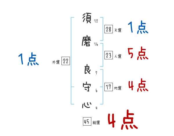 天運![]() | 須磨良守心さんの天運は28画の1つ星!家庭環境に注意。スポーツで活躍できる能力があるかも。 家系が持つ宿命的な運勢を表します。祖先から受け継いだ苗字ですので自分の力が及びません。家柄を象徴します。 |