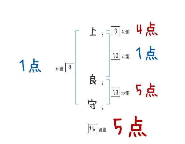 天運![]() | 上良守さんの天運は3画の4つ星!活動的で才能に恵まれ、多くの信頼を得る。希望に満ち成長する。 家系が持つ宿命的な運勢を表します。祖先から受け継いだ苗字ですので自分の力が及びません。家柄を象徴します。 |