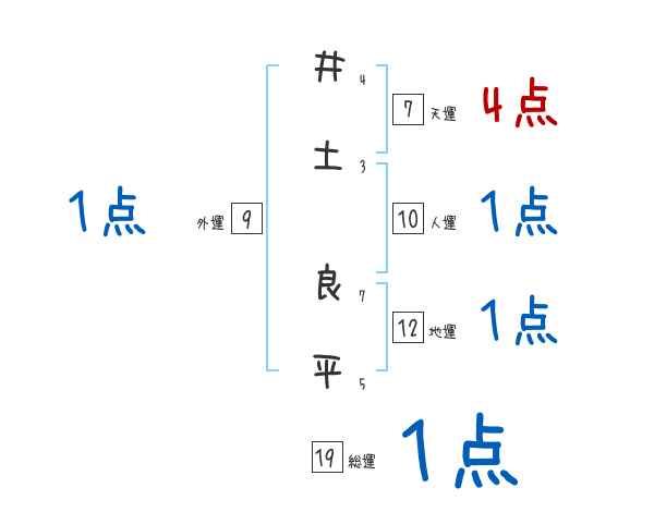 天運![]() | 井土良平さんの天運は7画の4つ星!強い意志や信念を持ち独立心が強い。自立する。 家系が持つ宿命的な運勢を表します。祖先から受け継いだ苗字ですので自分の力が及びません。家柄を象徴します。 |