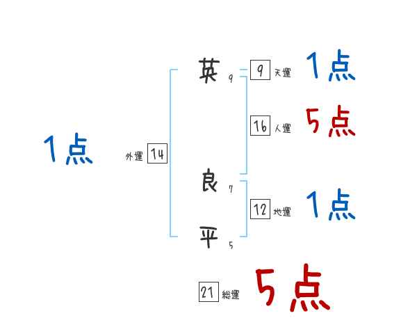 天運![]() | 英良平さんの天運は9画の1つ星!消極的で才能を発揮することが苦手なことも。周りの意見に耳を傾けましょう。 家系が持つ宿命的な運勢を表します。祖先から受け継いだ苗字ですので自分の力が及びません。家柄を象徴します。 |