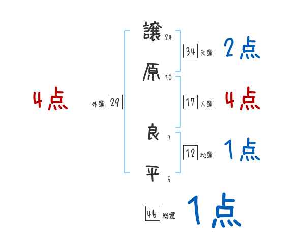 天運![]() | 譲原良平さんの天運は34画の2つ星!独創性に優れるが、自尊心が強く災難に注意しましょう。 家系が持つ宿命的な運勢を表します。祖先から受け継いだ苗字ですので自分の力が及びません。家柄を象徴します。 |