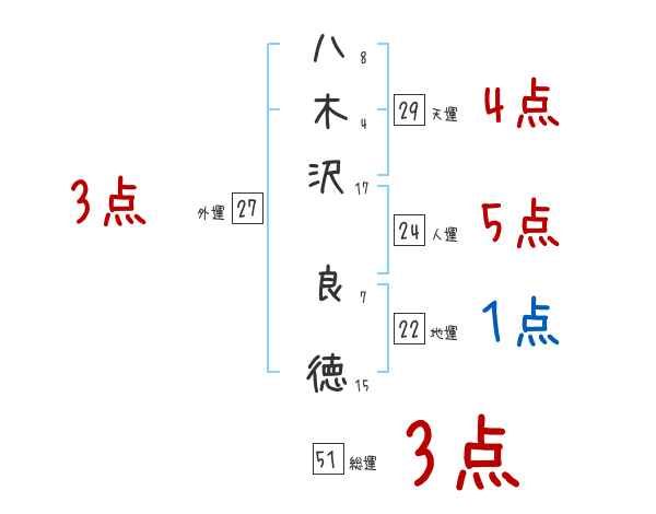 総運![]() | 八木沢良徳さんの総運は51画の3つ星!変化が激しく、危険に注意。堅実な性格。 あなたの人生を表す1番重要な運勢です。生涯を通じて影響する総合運となり、主に50歳以降の晩年期に影響を及ぼします。 |