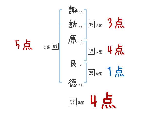 総運![]() | 諏訪原良徳さんの総運は58画の4つ星!安定した生活。大器晩成タイプ。 あなたの人生を表す1番重要な運勢です。生涯を通じて影響する総合運となり、主に50歳以降の晩年期に影響を及ぼします。 |