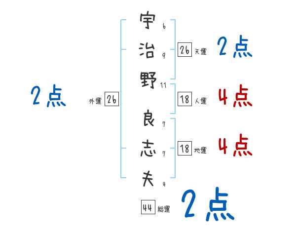 総運![]() | 宇治野良志夫さんの総運は44画の2つ星!誠実で慎重な性格。物事を考えすぎないように注意しましょう。 あなたの人生を表す1番重要な運勢です。生涯を通じて影響する総合運となり、主に50歳以降の晩年期に影響を及ぼします。 |