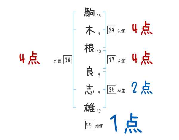 天運![]() | 駒木根良志雄さんの天運は29画の4つ星!完全主義で才能がある。厳格な心の持ち主。 家系が持つ宿命的な運勢を表します。祖先から受け継いだ苗字ですので自分の力が及びません。家柄を象徴します。 |