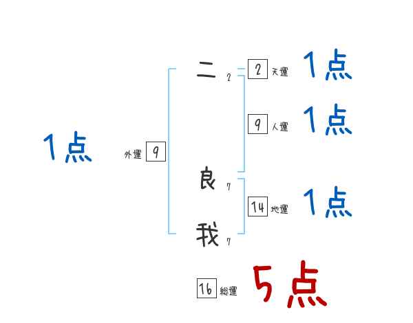 天運![]() | 二良我さんの天運は2画の1つ星!優しいですが積極性や意思の強さに欠ける傾向があります。家庭環境の乱れに注意しましょう。 家系が持つ宿命的な運勢を表します。祖先から受け継いだ苗字ですので自分の力が及びません。家柄を象徴します。 |