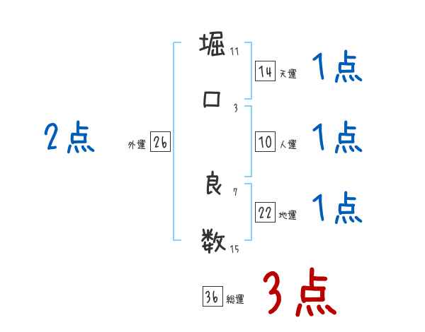 外運![]() | 堀口良数さんの外運は26画の2つ星!波瀾万丈かも。信頼できる人を大事にしましょう。 生活面を象徴する運勢です。外部から受ける影響力を表し、結婚運、家庭運や職場、環境への順応性を表します。 |