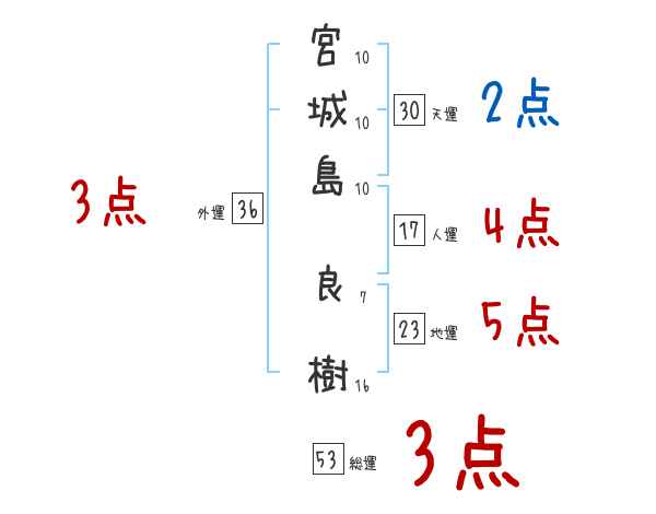 外運![]() | 宮城島良樹さんの外運は36画の3つ星!先見性が豊かです。多少神経質で苦労することも。 生活面を象徴する運勢です。外部から受ける影響力を表し、結婚運、家庭運や職場、環境への順応性を表します。 |