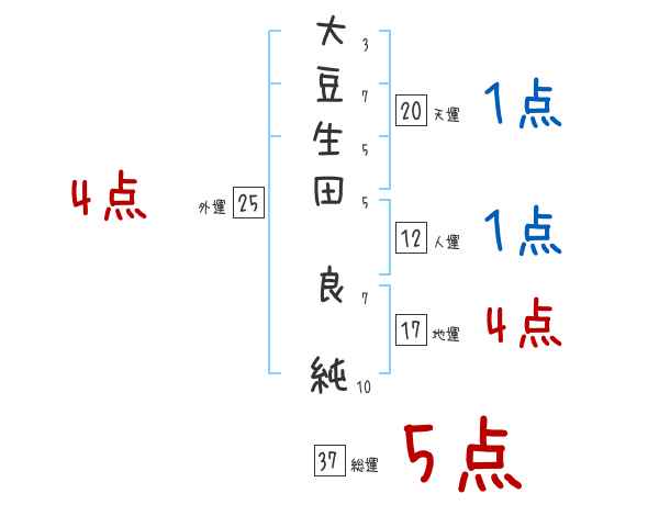 総運![]() | 大豆生田良純さんの総運は37画の5つ星!努力家で順応性に優れる。現実的な考え方ができ忠実に物事をこなす。 あなたの人生を表す1番重要な運勢です。生涯を通じて影響する総合運となり、主に50歳以降の晩年期に影響を及ぼします。 |
