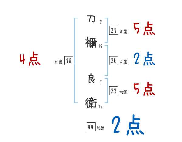 地運![]() | 刀禰良衛さんの地運は23画の5つ星!想像力に優れ活力がある。一代で成功し名誉を手に入れる。 個性を表す基礎的な運勢です。性格形成や対人関係、行動力など家庭環境に影響されます。主に誕生してから20歳くらいまでの若年期の運勢を表します。 |