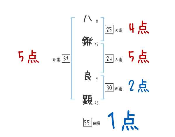 天運![]() | 八鍬良顕さんの天運は25画の4つ星!個性があり才能があふれる。強運の持ち主で発展する。 家系が持つ宿命的な運勢を表します。祖先から受け継いだ苗字ですので自分の力が及びません。家柄を象徴します。 |
