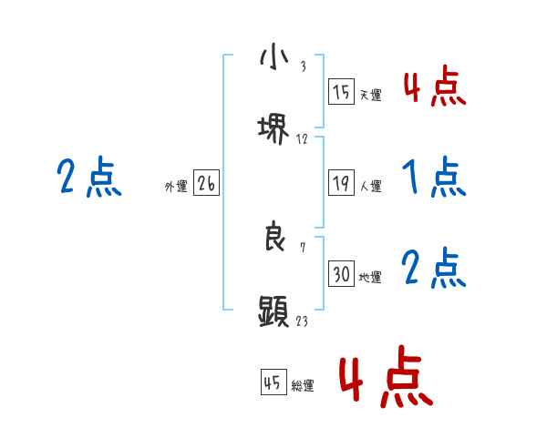 外運![]() | 小堺良顕さんの外運は26画の2つ星!波瀾万丈かも。信頼できる人を大事にしましょう。 生活面を象徴する運勢です。外部から受ける影響力を表し、結婚運、家庭運や職場、環境への順応性を表します。 |