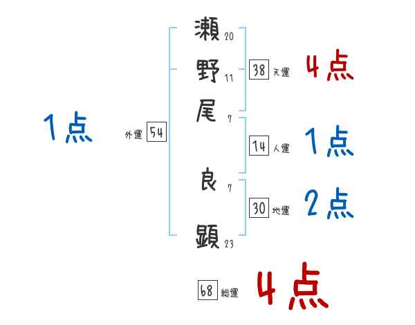 総運![]() | 瀬野尾良顕さんの総運は68画の4つ星!潜在能力が高く集中力が高い。勤勉に励み発展する。 あなたの人生を表す1番重要な運勢です。生涯を通じて影響する総合運となり、主に50歳以降の晩年期に影響を及ぼします。 |