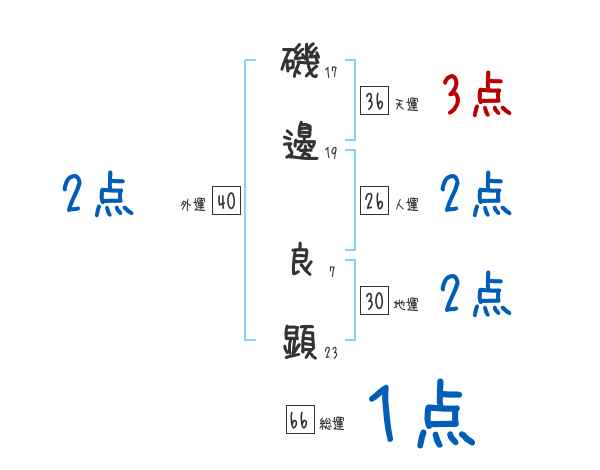 天運![]() | 磯邊良顕さんの天運は36画の3つ星!先見性が豊かです。多少神経質で苦労することも。 家系が持つ宿命的な運勢を表します。祖先から受け継いだ苗字ですので自分の力が及びません。家柄を象徴します。 |