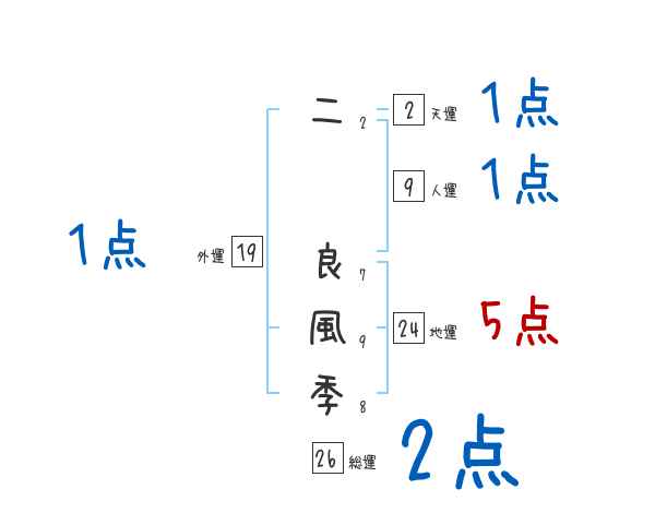 外運![]() | 二良風季さんの外運は19画の1つ星!優れた才能を持ちますが、協調性が足りないことも。周りの人と協力する事を意識しましょう。 生活面を象徴する運勢です。外部から受ける影響力を表し、結婚運、家庭運や職場、環境への順応性を表します。 |